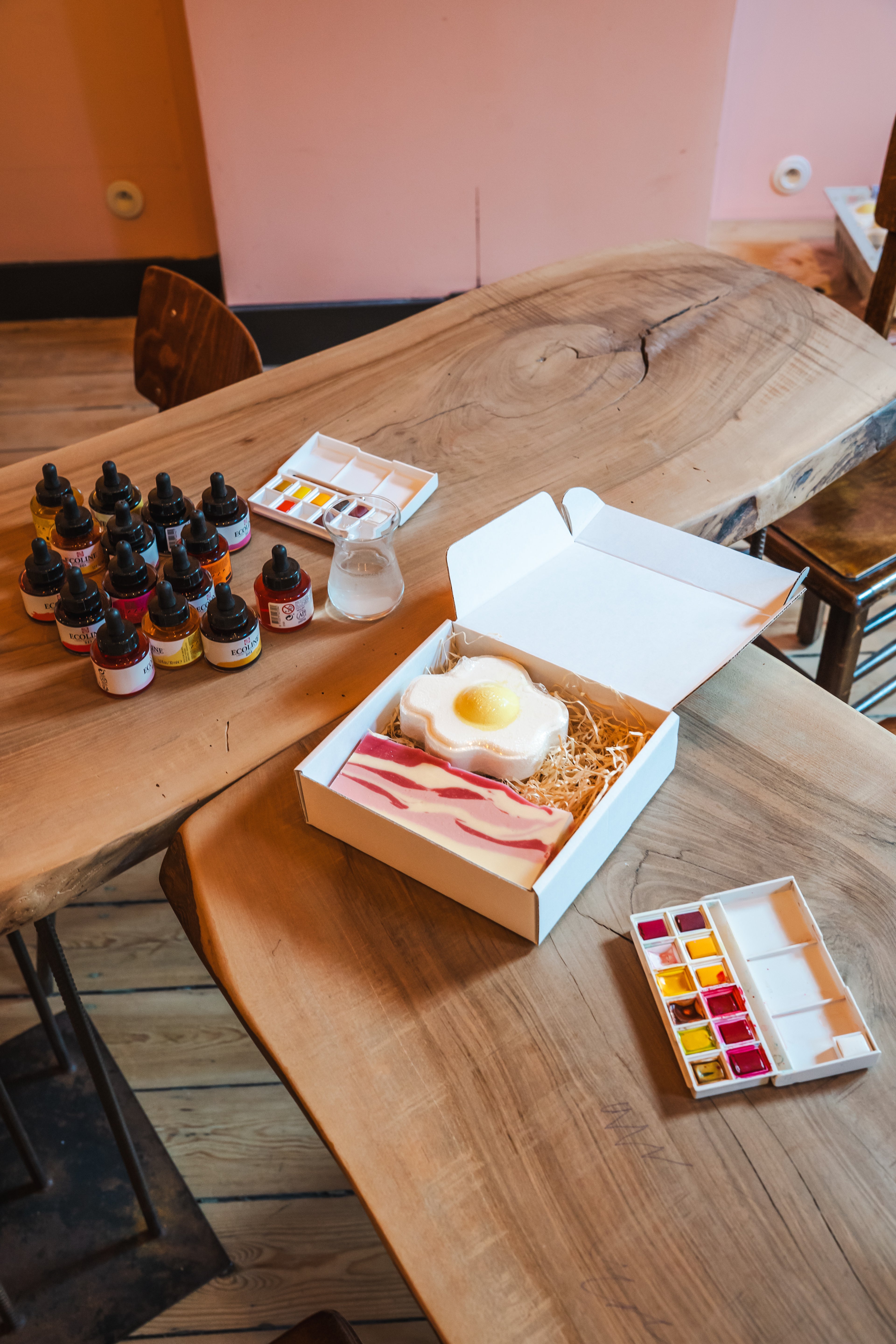 Een bruisbal spiegelei en een spekzeep - Het perfecte eindejaarsgeschenk om te geven én te krijgen! De verpakking is met de hand beschilderd tijdens een sfeervol ontbijt met spek en eieren. Daardoor is elke doos volledig uniek — een extra speciaal detail dat dit cadeautje nog leuker maakt.